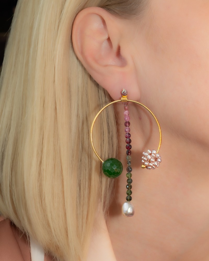 Χειροποίητα σκουλαρίκια σε επιχρυσωμένο ασήμι 925 με τουρμαλίνες, πράσινο αχάτη, λευκά και ροζ μαργαριτάρια
